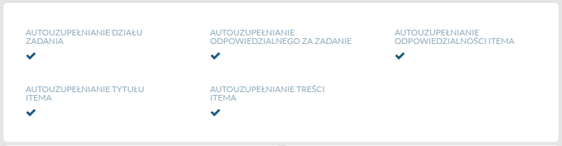 Wprowadzono nowy segment do Konfiguracji Projektu, który pozwala na włączenie opcji automatycznego uzupełniania wartości w zadaniach i itemach tworzonych w ramach danego projektu (opcje są konfigurowane per projekt). Użytkownik może włączyć automatyczne uzupełnianie dla następujących pól: