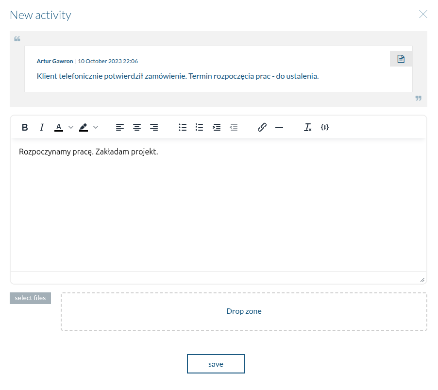 Funkcjonalność cytowania poprawia spójność i przejrzystość komunikacji w module CRM. Umożliwia użytkownikom szybkie powoływanie się na wcześniejsze ustalenia w nowych notatkach, co eliminuje konieczność przepisywania informacji.