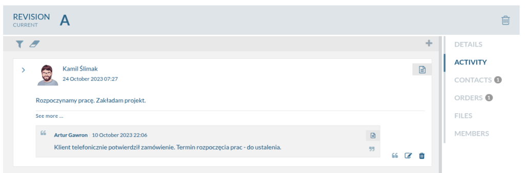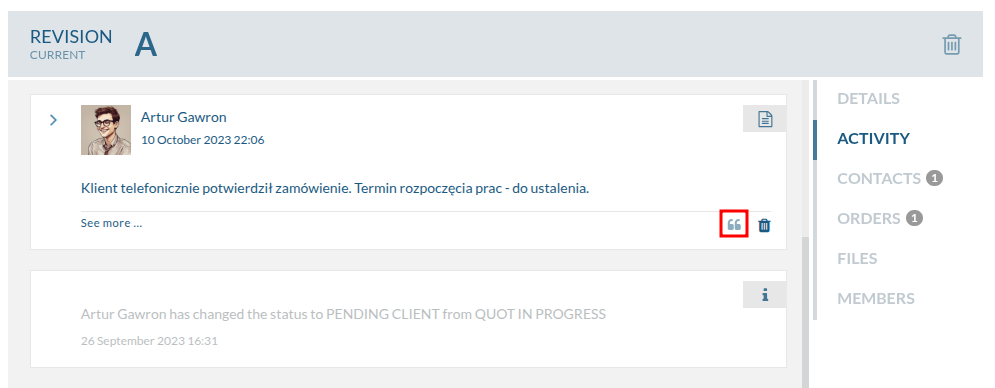 Wprowadzono funkcję cytowania istniejących wpisów w zakładce Aktywność (Activity).