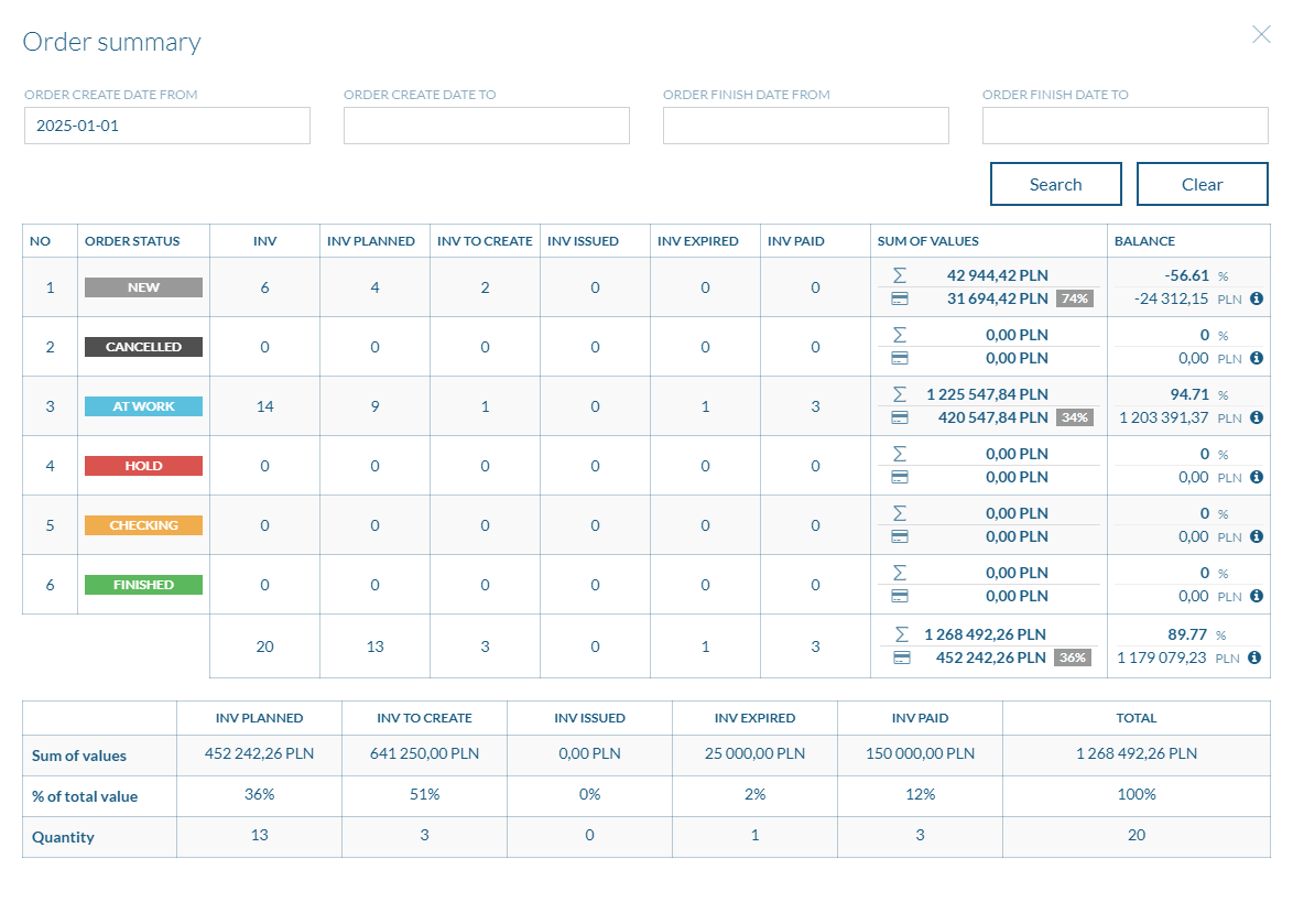 Na podsumowaniu zamówień dodano możliwość filtrowania po dacie zakończenia (finished), ujednolicono ikony oraz dodano kolumnę z parametrem balance.