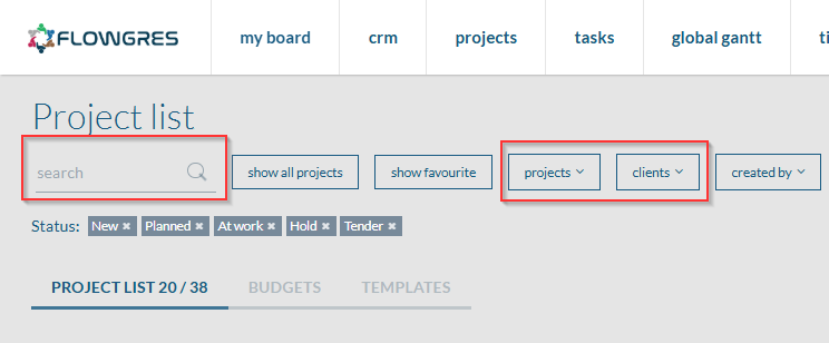 Dodano wyszukiwarkę oraz filtry Projects i Clients na liście projektów, co ułatwia szybkie przeszukiwanie.