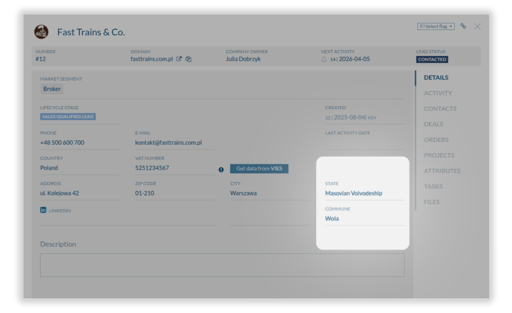 W profilu firmy wprowadzono możliwość określenia gminy, której lista wyboru dynamicznie dostosowuje się do uprzednio wskazanego województwa. Funkcja ta znacznie przyspiesza uzupełnianie danych adresowych i skutecznie zapobiega błędom przy ręcznym wprowadzaniu informacji. Zapewnia to większą precyzję w zarządzaniu bazą kontrahentów, ułatwiając późniejsze filtrowanie i organizację pracy według określonych regionów.