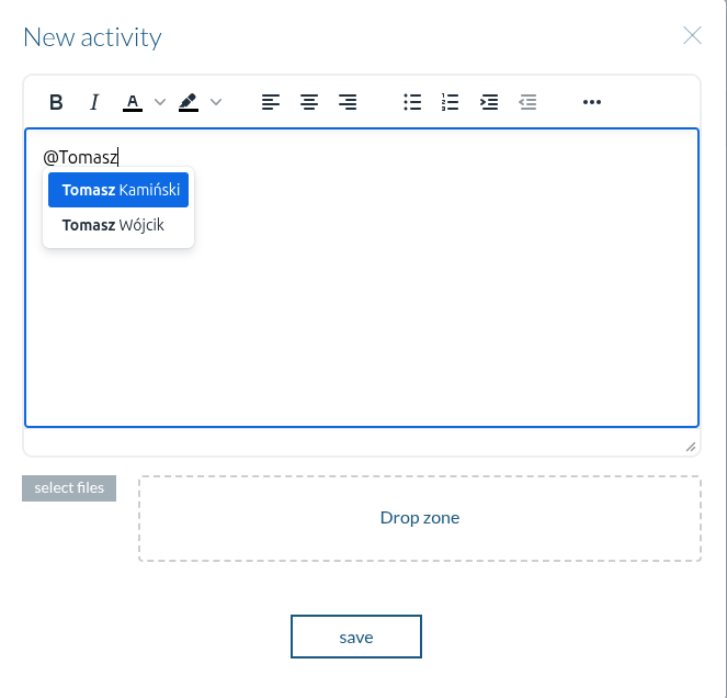 Wprowadzono mechanizm wywoływania użytkowników za pomocą symbolu @ w formularzu dodawania nowej aktywności w widokach Firm (Companies) i Kontaktów (Contacts).