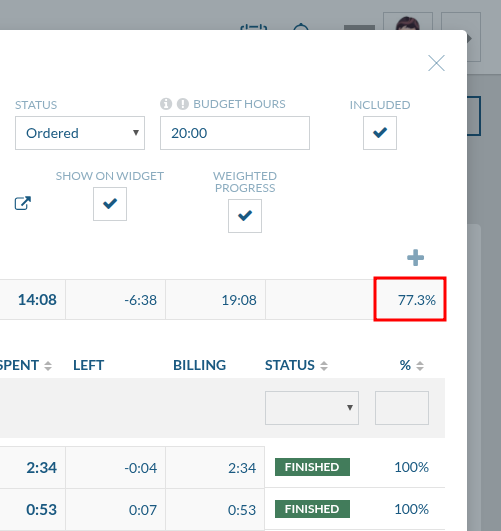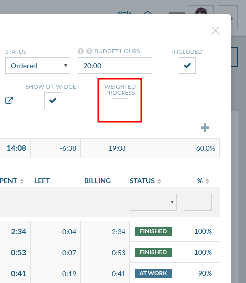 W widoku edycji budżetu wprowadzono nową funkcję „Weighted Progress”. Po jej aktywacji system automatycznie przypisuje wagę każdemu zadaniu, bazując na jego udziale w całkowitej puli godzin przewidzianych w budżecie.